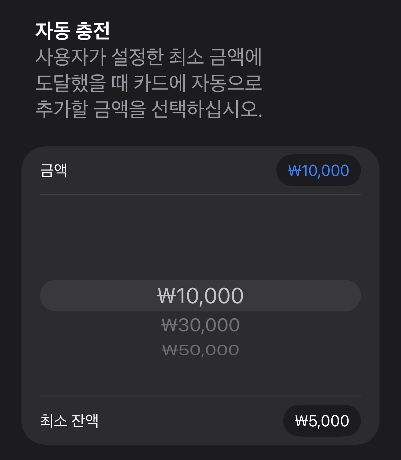 - 충전 기준 금액 설정 (예: 5,000원 이하)